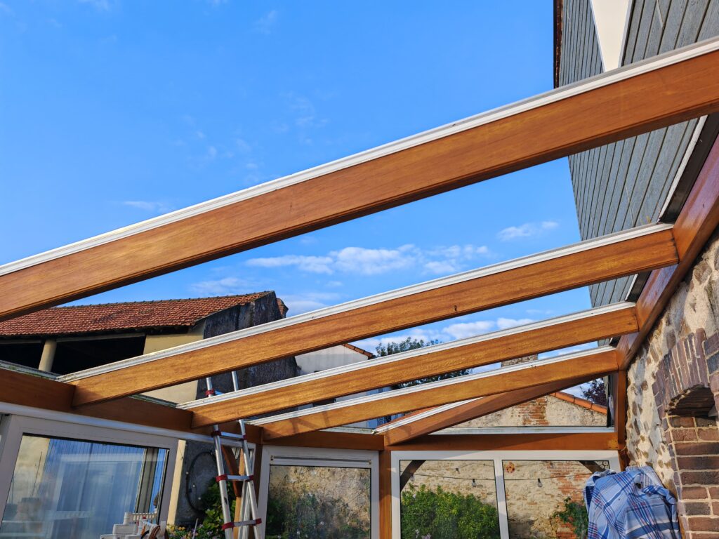 À l’origine, cette véranda était le joyau de la maison. Sa structure en bois, chaleureuse et noble, lui conférait un cachet indéniable. Cependant, avec les années, sa toiture en polycarbonate alvéolaire avait perdu ses qualités.